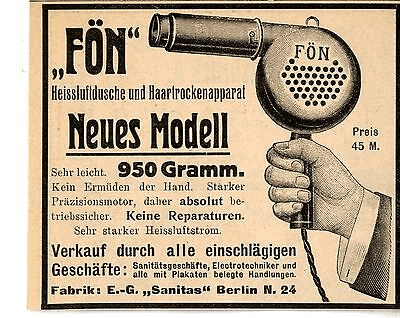 Die Ingenieure des Berliner Unternehmens AEG (Allgemeine Elektricitäts-Gesellschaft AG) arbeiteten intensiv daran, Elektrizität alltagstauglich zu machen. Im Jahr 1900 entwickelten sie die sogenannte „Heißluftdusche“ – ein elektrisches Gerät, das rund zwei Kilogramm wog. Es wurde nicht nur als Haartrockner, sondern auch als medizinisches Hilfsmittel gegen Muskelverspannungen, Rheuma und Furunkel beworben. Doch mit Temperaturen von bis zu 90 °C bestand Verbrennungsgefahr – grundlegende Verbesserungen waren dringend nötig.