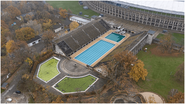 Стоит вспомнить эту часть комплекса, которую знают современные берлинцы, как Олимпийский плавательный стадион – Sommerbad Olympiastadion. Там проходили XI соревнования по плаванию и летние Олимпийские игры 1936 года в Берлине, тот факт, что спортсмены могли плавать в воде, которая сохраняла температуру 21°C, привлек тогда внимание всего мира. Бассейн не пострадал во время бомбардировок Второй мировой войны, поэтому был открыт для населения в июне 1945 года. А в 1978 году его модернизировали к Чемпионату мира по плаванию.