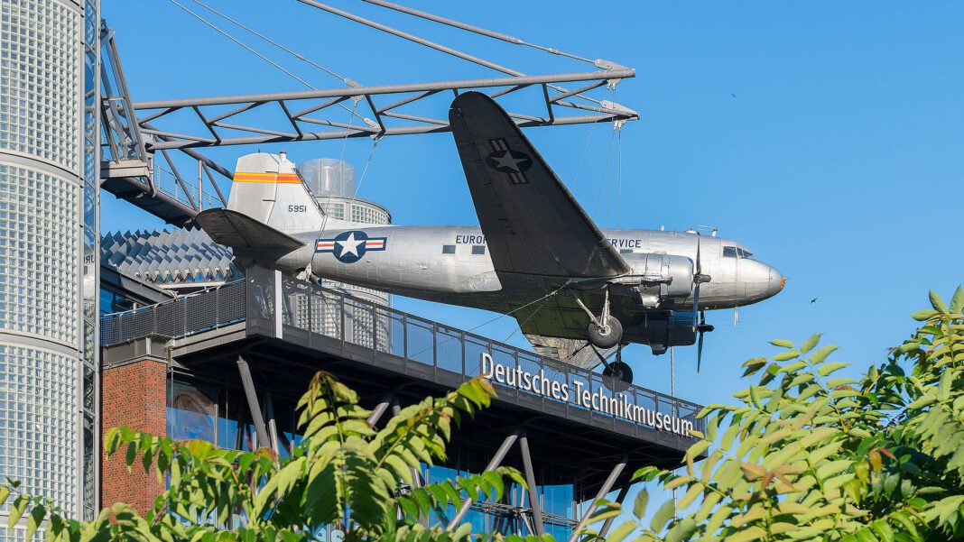 Крышу выставочного комплекса украшает Douglas C-47 Skytrain. Во время Берлинского воздушного моста такого типа самолеты обеспечивали Западный Берлин продовольствием и жизненно важными вещами. В частности, это происходило в условиях блокады Западного Берлина в 1948–1949 годах войсками Советского Союза. СССР перекрыл доступ к железнодорожным и автомобильным путям в Западный Берлин, который находился под контролем союзников (США, Великобритании и Франции). Такие самолеты называют «изюмными бомбардировщиками» (Rosinenbomber), поскольку по собственной инициативе американские экипажи перед посадкой сбрасывали с них берлинским детям небольшие пакеты со сладостями на самодельных маленьких парашютиках. В этих пакетиках чаще всего были шоколад и жевательная резинка, а также, предположительно, изюм.