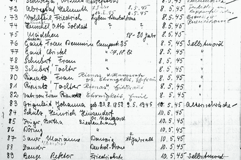 Дані про самогубства в останні дні квітня та на початку травня 1945 р. відсутні. Деяку інформацію дає статистичний збірник «Берлін у цифрах» 1949 р. Там зазначено, що кількість смертей сягнула 7057.