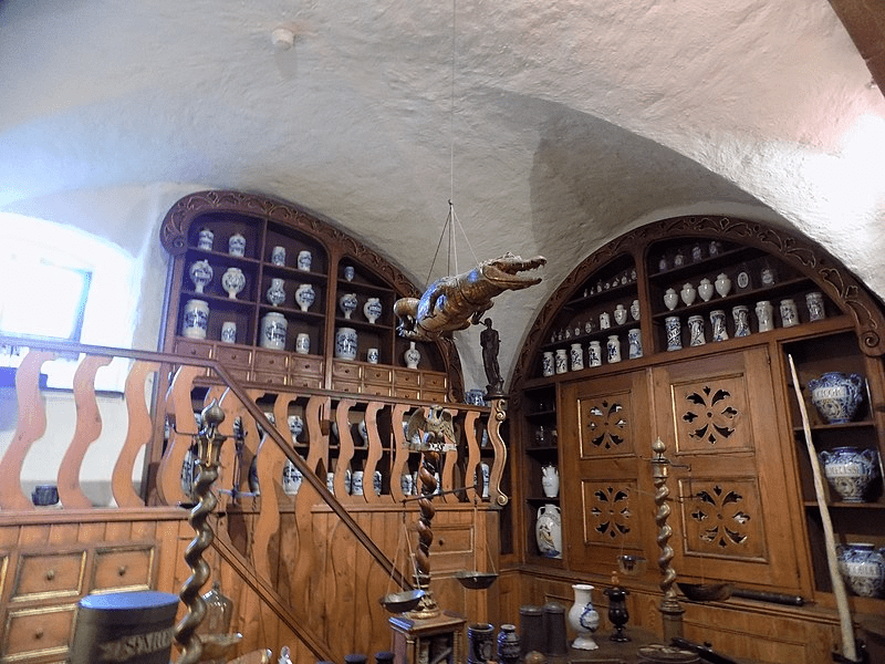 Особливістю цієї аптеки є інтер’єр з темного дерева 1886 р., який зараз відреставрований. Шафи, столи, стелажі, попри давній вік, перебувають в хорошому стані. З 1960 р. аптека має статус пам’ятки архітектури, а тому тут багато туристів. Особливо їх вражають розписи стелі.